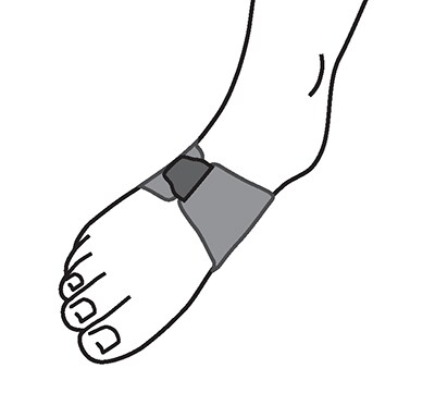 1. Åpne stroppen med borrelås og sett støtten slik at den sitter behagelig under fotbuen (fotikonene skal settes mot innsiden av buen).